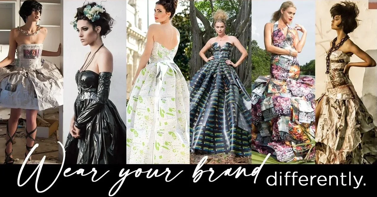 We use your brochures, event posters, packaging, or even plantable paper to construct one-of-a-kind couture pieces that command attention while embodying your commitment to sustainability.